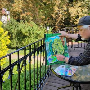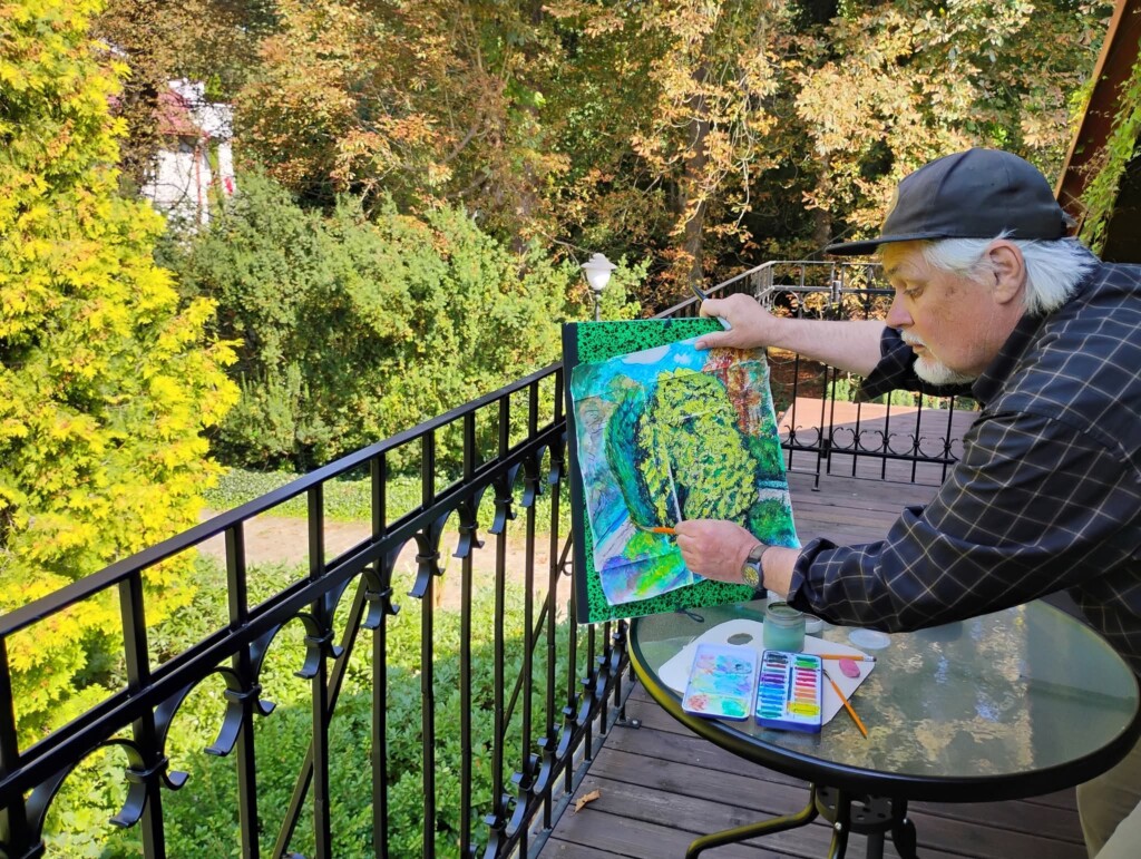 Peter Poplaski. Mam 74 lata. Jestem artystą: malarzem, grafikiem, rysownikiem, autorem i projektantem książek. Pochodzę z Green Bay w stanie Wisconsin, miasta na Środkowym Zachodzie, na północ od Chicago, położonego nad jeziorem Michigan w Stanach Zjednoczonych. Jako artysta dużo podróżowałem po Ameryce i Europie, studiując we wszystkich wielkich muzeach, aby uczyć się od wielkich mistrzów sztuk pięknych. Do tego stopnia, że połowę czasu spędzam we Francji. Niektórzy określają moją twórczość jako „ac-ka-dem-ekkk”, jednak ja wolę określać się mianem „jankeskiego realisty” i opieram wszystko na surowym spojrzeniu na miejsce i chwilę, które prowokuje natychmiastową reakcję na przełożone doświadczenie, które można uznać za prawdziwe. Dlatego pracuję z natury tak często, jak to możliwe, ale zdarzają się chwile, gdy wizja, która mnie zainspirowała, musi zostać rozszerzona. Nie ma skrótów, tylko wyzwanie, by stawić czoła i stworzyć coś trwałego. Tak właśnie stało się z moją wizytą w Arboretum Bolestraszyce. Spojrzałem z pokładu i zacząłem rysować, co musiało stawać się coraz większe, aby objąć wszystko, na co patrzyłem, co przekształcało się w większy obraz malarski. Jako artysta zawsze miałem prawą nogę w sztuce, a lewą w komercyjnych projektach wydawniczych związanych z komiksami, więc pracowałem z projektami Marvel Comics i DC Comics, a także z artystami hipisowskimi z undergroundu z lat 60. To było zabawne i pouczające. Dla Marvela pracowałem nad Spider-Manem i Thorem, a dla DC zrobiłem 24 okładki książek dla Supermana, Batmana i Wonder Woman. Mogłem rysować, co chciałem. Zrobiłem również dwie różne biografie Roberta Crumba, znanego artysty undergroundowego.