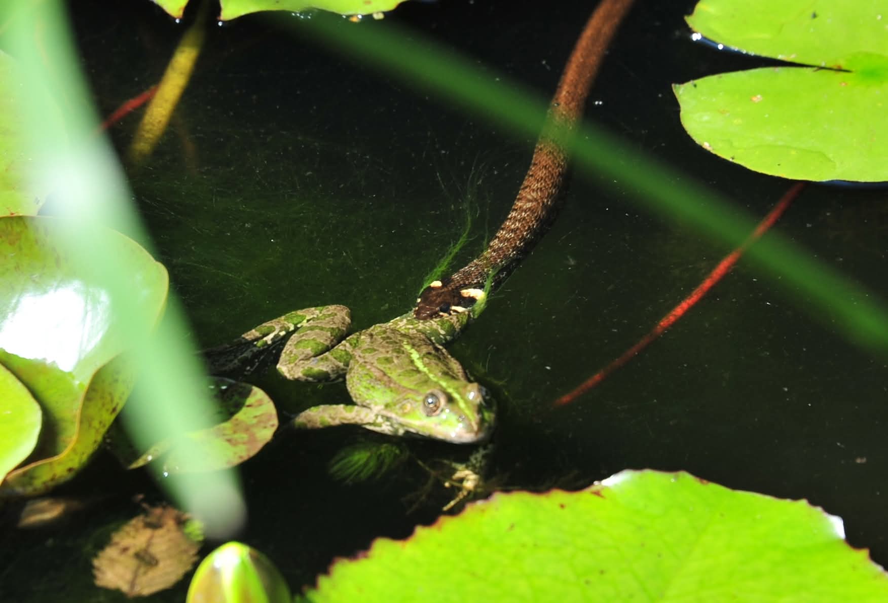 Teraźniejszość. Początek sierpnia. Karmiąc ryby, przy jednym z oczek wodnych natknąłem się na nietypową sytuację. Sześć osób z wielkim zainteresowaniem, wręcz zahipnotyzowanych, wpatruje się w lustro wody. Osoby te stojąc w zupełnym bezruchu, bez słowa, oglądały coś, co zajęło je tak, że świata poza tym nie widziały. Zaciekawiony podszedłem i ja. Oczom moim ukazał się widok wręcz nieprawdopodobny. Ujrzałem niezwykłe misterium, które na żywo mogą oglądać jedynie nieliczni. W oczku trwała walka na śmierć i życie. Średniej wielkości zaskroniec zaatakował dosyć okazałą żabę. Żaba miotała się próbując uratować swoje życie, zaskroniec chciał je jej odebrać po to, aby przeżyć. Widowisko niezwykłe, niespotykane. Zachowując resztki zimnej krwi, pobiegłem po aparat i stąd te kilka fotografii, które publikuję poniżej.