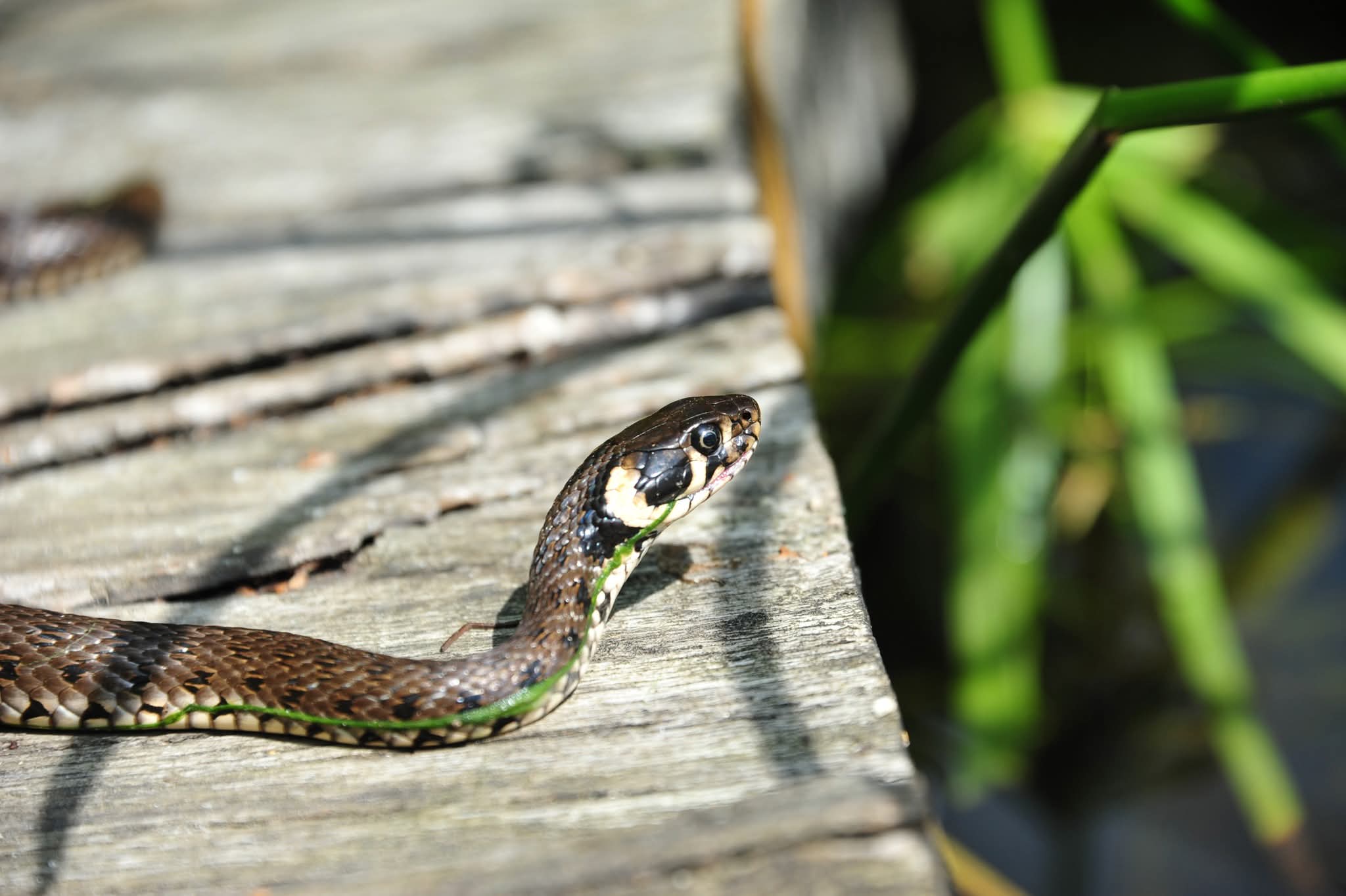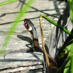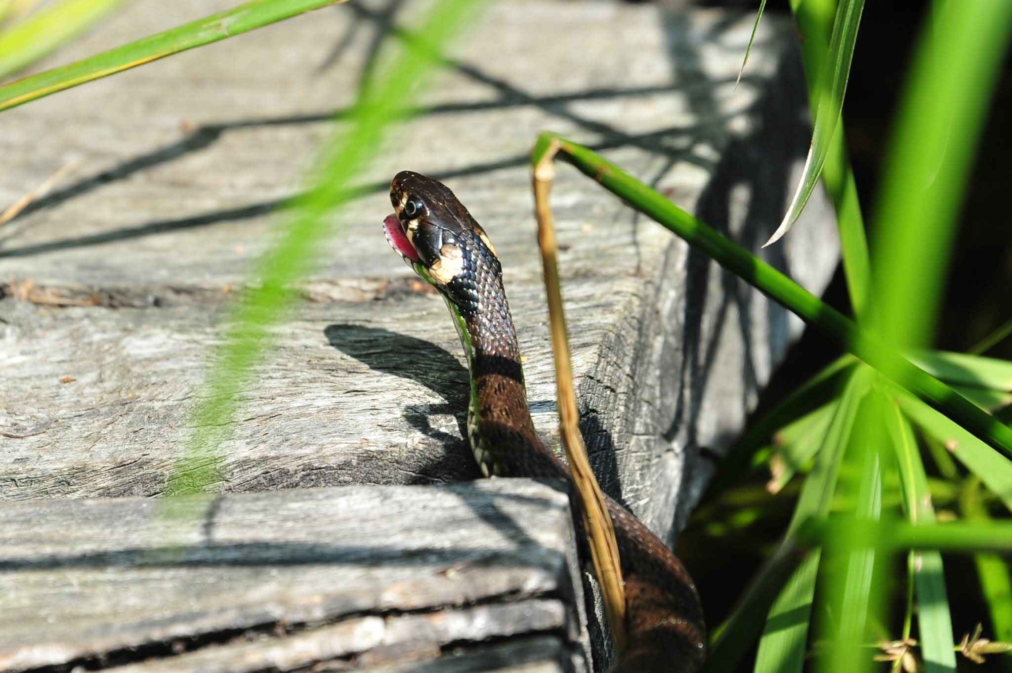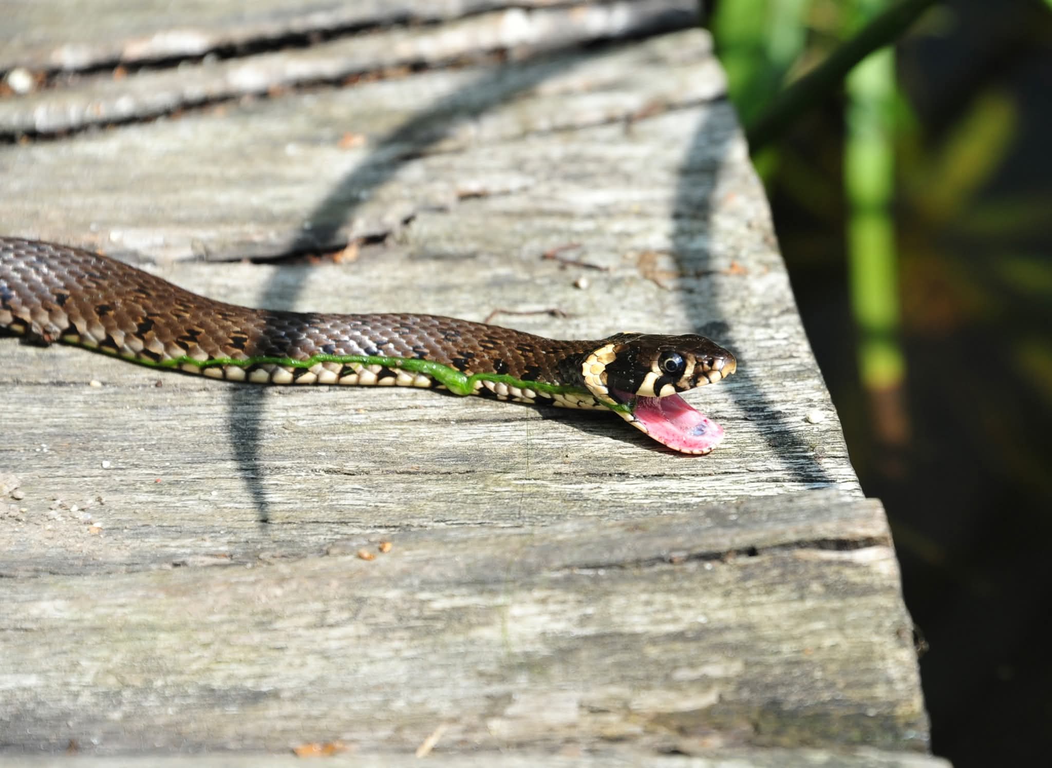 Spójrzcie sami. Wypełzł na deski okalające oczko wodne. Trochę chyba zdezorientowany, na swój sposób zawstydzony. Bo przecież został pokonany przez żabę. O jakimkolwiek posiłku przez co najmniej kilka dni trzeba będzie zapomnieć. Jego ciało zostało bardzo mocno nadwyrężone podczas tej szarpaniny. Zwłaszcza szczęki, których rozwarcie co chwilę prezentował, tak jakby chciał je sobie samodzielnie nastawić. Przy tej okazji możemy też przekonać się, że zwierz ten nie posiada tzw. zębów jadowych, których wielu z nas tak się obawia. Mało tego nie posiada nawet zębów, które mogą zagrozić zwykłej żabie a co dopiero ludziom. Z całego zdarzenia gadowi temu została w pysku jakaś wodna trawa, obolałe ciało, pusty żołądek, a w głowie świadomość porażki z „posiłkiem". Czy można na tej podstawie powiedzieć o tym wężu, że nie taki diabeł straszny jak go malują? Pewnie nie. Zaskroniec ten, jeżeli przeżyje, pewnie znowu będzie chciał pożreć jakąś żabę. Taka jego dzika natura. A jeżeli chodzi o jego relacje z człowiekiem, to nie ma ze strony zaskrońca żadnego dla nas zagrożenia. Gad ten ustępuje przed nami w każdej sytuacji. Jest zwierzęciem o najbardziej zszarganej reputacji ze wszystkich zwierząt występujących w naszym środowisku. Zupełnie niesłusznie i niesprawiedliwie. Jest często przez ludzi zabijany właśnie z powodu zwykłego strachu przed nim. A i bez nas - ludzi - ma on bardzo ciężkie życie. Kurczy się jego naturalne środowisko. Wysychające zbiorniki wodne, bagna, na pewno mu nie sprzyjają. Pada ofiarą bociana, czapli, jeża, psa, kota, lisa, borsuka, ptaków drapieżnych. Praktycznie żadne zwierzęta się go nie boją, ponieważ nie stanowi dla nich żadnego zagrożenia. Paradoksalnie, boją się go przeważnie ludzie. Dlaczego? Sami sobie odpowiedzmy na to pytanie.